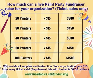 Our mission is to collaborate with and support the fundraising and fellowship needs of our community through our live Paint Party events, Virtual "Paint-Alongs" DIY Creative Art Kits to Go, and select raffle basket donations.